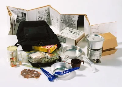 Other pieces include George Brecht's Valoche / A Flux Travel Aid, a box containing an assortment of quirky artisanal children's toys, including a jump rope, a chess piece and plastic eggs, and Rirkrit Tiravanija's Without Title (Rucksack Installation), a kit of camping essentials.