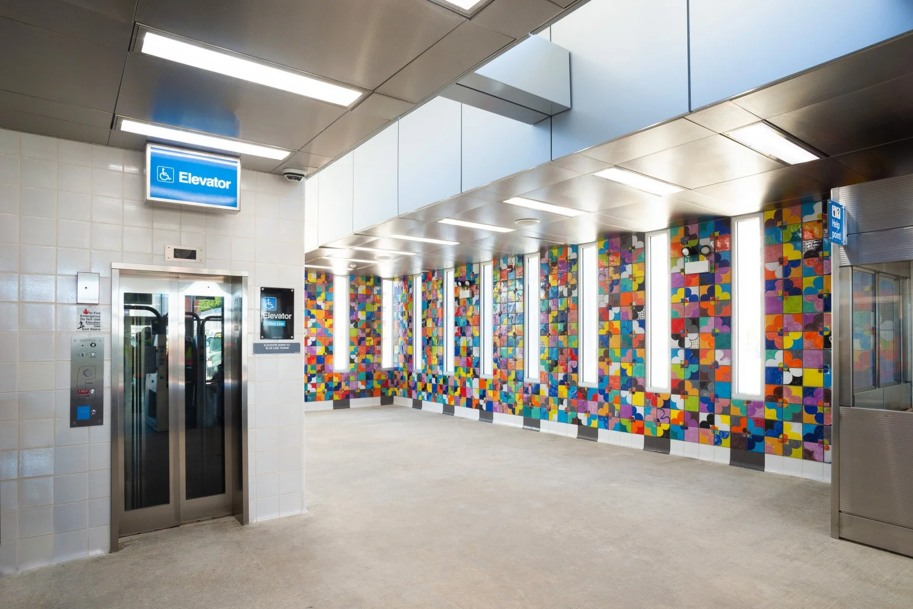 Judy Ledgerwood’s new permanent, site-specific installation is open now at the CTA’s newly renovated Blue Line Racine Station. The Racine stop renovation is part of the Chicago Transit Authority (CTA)’s multi-year project to make the Blue Line Forest Park Branch fully accessible. Composed of 704 unique, hand-made ceramic tiles, Ledgerwood’s new public artwork, titled Flowers for the Blue Line Racine Station, spans 40 feet of wall space from floor to ceiling, wrapping around the station’s north and west walls to greet commuters as they enter.